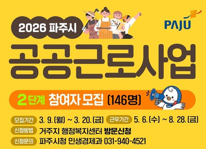 [경기경제신문] 파주시가 오는 20일까지 2026년 2단계 공공근로사업 참여자 146명을 모집한다.