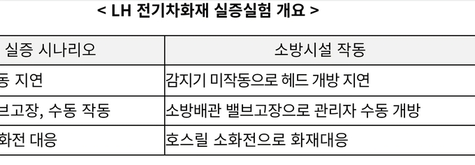 실험은 스프링클러 감지기 미작동, 밸브 고장 등 화재 가혹도가 증가한 경우를 가정한 3개의 시나리오로 진행됐다. LH는 실험을 통해 확보한 실증 데이터를 토대로 중요 소화시설인 스프링클러와 호스릴 소화전의 전기차 화재 대응 효과를 입증하고, 합리적이고 안전한 소방시설 기준을 마련할 예정이다.
