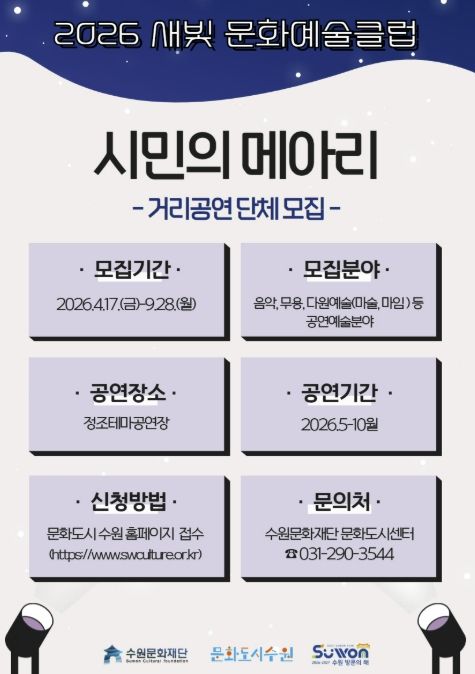 [경기경제신문] 수원문화재단은 지역 공연예술의 활성화와 수원시민의 주체적 문화예술 참여를 위해 ‘새빛 문화예술클럽 '시민의 메아리'’ 사업에 참여할 생활예술단체를 모집한다.