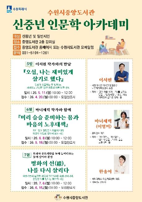 [경기경제신문] 수원시 중앙도서관이 5월부터 7월까지 매달 1회 운영하는 ‘신중년 인문학 아카데미’ 수강생을 모집한다.