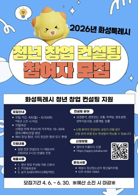 [경기경제신문] 화성특례시는 오는 6월 30일까지 ‘2026년 청년 창업 컨설팅 지원사업’ 참여자를 모집한다.