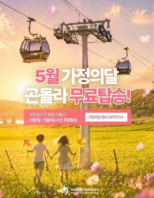 이백현 파주디엠지곤돌라㈜ 대표는 “가정의 달을 맞아 온 가족이 함께 방문해 특별한 추억을 남길 수 있도록 이번 행사를 준비했다”라며 “‘파주임진각평화곤돌라’에서 가족과 함께 평화의 가치를 체험하는 의미 있는 시간이 되길 바란다”라고 밝혔다.