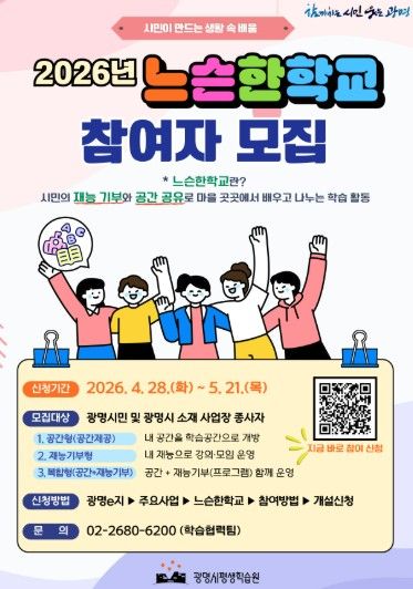 [경기경제신문] 광명시가 시민이 직접 가르치고 배우는 시민참여형 평생학습 프로그램 ‘느슨한학교’ 신규 운영자를 오는 5월 21일까지 모집한다.