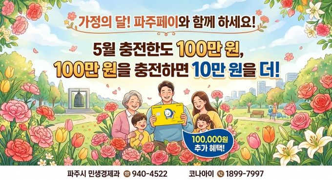 [경기경제신문] 파주시는 5월 가정의 달을 맞아 5월 1일부터 5월 31일까지 한 달간 지역화폐 파주페이의 월 충전한도를 기존 70만 원에서 100만 원으로 상향한다.