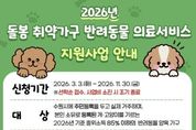 [경기경제신문] 수원특례시는 돌봄 취약가구의 반려동물 양육 부담을 덜고 동물복지를 강화하기 위해 ‘2026년 돌봄 취약가구 반려동물 의료서비스 지원사업’을 추진한다. 지원 대상은 수원시에 주민등록을 두고 실제 거주하며 본인 명의로 반려동물을 등록해 기르는 기준중위소득 85% 이하 가구다. 저소득층, 중증장애인, 한부모가정, 다문화가정, 1인가구 등이 포함된다. 경기도 공공입양기관에서 국가봉사동물을 입양한 경우는 소득과 관계없이 지원한다. 보호자 1명당 2마리까지 신청할 수 있다. 동일 동물은 ‘의료·돌봄·장례 지원’ 또는 ‘노령동물 종합건강검진’ 중 한 가지 항목만 선택해 지원한다. 의료·돌봄·장례 지원은 마리당 최대 16만 원(초과비용 자부담), 노령동물 종합건강검진은 최대 32만 원(초과비용 자부담)까지 지원한다. 노령동물 검진은 2019년 12월 31일 이전 출생한 반려동물에 한한다. 의료지원에는 백신접종, 중성화수술, 기본검진·치료비 등이 포함되고, 돌봄 위탁비와 장묘 서비스도 지원한다. 노령 반려동물은 종합건강검진을 받을 수 있으며 모든 서비스는 관내 업체를 이용해야 한다. 신청 기간은 3월 3일부터 11월 30일까지다. 서비스 이용 후 신청서와 서