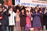 [경기경제신문] 이재준 수원특례시장은 1일 아침 팔달산 서장대에서 시민들과 함께 해맞이를 하고, “시민 여러분께서 소망하시는 모든 것을 성취하시길 기원하겠다”고 말했다. 이재준 시장은 “올해도 시민 여러분과 함께 수원을 더 새롭고, 더 빛나게 만들기 위해 노력하겠다”며 “모든 시민이 수많은 역사와 희망을 만드는 멋진 한 해가 되길 바란다”고 기원했다. 서장대 일원을 가득 메운 시민들은 떠오르는 해를 보며 함께 소원을 빌었다. 수원시는 12월 31일 저녁부터 1월 1일 아침까지 일원에서 시민들과 함께하는 송년·신년 행사를 열었다. 12월 31일 밤 10시 30분부터 행궁광장 특설무대에서 ‘제야음악회’가 열렸다. 자정에는 여민각에서 제야 타종 행사를 열고 2026년 병오년(丙午年)의 시작을 알렸다. 이재준 시장, 이재식 수원특례시의회 의장, 김영진(수원시병)·김준혁(수원시정) 의원, 시민 대표 등이 타종했다. 이재준 수원시장과 김현수 제1부시장, 4개 구청장, 실·국장 등은 1일 오전 9시 현충탑을 참배했다.