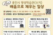 [경기경제신문] 용인특례시는 25일부터 26일까지 수지구에 있는 용인시 평생학습관에서 특별강좌 수강생을 모집한다고 17일 밝혔다. 이번 특별강좌는 4주 과정으로, 시민의 수요를 반영해 실생활에 도움이 되는 다양한 강좌로 구성됐다. 총 8개 강좌를 운영하며 112명의 수강생을 모집한다. 주요 프로그램은 ▲인문교양 분야(K-세계유산, 현장에서 멋보기) ▲뷰티 분야(체형 진단 패션스타일 찾기) ▲정보화 분야(디지털 사진 입문: 스마트폰으로 배우기) ▲조리 분야(우리 집 김치 만들기) ▲문화예술 분야(쉽고 편한 보컬 발성법 야간) 등이다. 교육은 3월 30일부터 4월 24일까지 진행되며 만 19세 이상 용인시민이라면 누구나 신청할 수 있다. 용인에 주소를 둔 재외국민, 결혼이민자, 용인 소재 기업에 재직 중인 직장인도 참여 가능하다. 접수는 용인시 평생학습관 누리집을 통해 선착순으로 진행된다. 수강료는 강좌별 수업 시간에 따라 1만 원에서 1만 5000원이며, 재료비는 별도로 개인이 부담한다. 시 관계자는 “시민이 배움의 가치를 느낄 수 있도록 실생활에 도움이 되는 다양한 평생학습 프로그램을 지속적으로 발굴하고 확대해 나가겠다”고 했다.