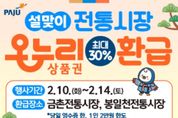 [경기경제신문] 파주시는 2026년 설 명절을 맞아 고물가로 인한 시민들의 가계 부담을 덜고 지역 전통시장 활성화를 도모하기 위해 ‘설맞이 농축산물 온누리상품권 환급 행사’를 실시한다. 이번 행사는 농림축산식품부가 주관하는 ‘농축산물 할인지원’사업의 일환으로, 본격적인 제수용품 구매 기간인ق월 10일부터 14일까지 5일간 관내 전통시장 2곳(봉일천전통시장, 금촌전통시장)에서 진행된다. 행사 기간 동안 참여 점포에서 국산 농축산물을 구매한 고객은 구매 금액에 따라 1만 원 또는 2만 원 상당의 온누리상품권을 환급받을 수 있다. 환급 기준은 ▲구매 금액이 3만 4천원 이상 6만 7천 원 미만일 경우 1만 원 ▲6만 7천 원 이상일 경우 2만 원이며, 환급 한도는 1인당 최대 2만 원이다. 단, 예산 소진 시 행사는 조기 종료될 수 있다. 환급을 희망하는 고객은 당일 구매 영수증과 신분증을 지참해 각 시장 내에 마련된 지정 환급처를 방문하면 된다. 환급 대상 품목은 국산 농산물 및 축산물이며, 수입산 농축산물이나 법인카드 결제 내역, 제로페이 모바일 상품권 결제 내역 등은 환급 대상에서 제외된다. 환급을 위해서는 반드시 점포에서 발급한 카드 전표나 현금영수증을 지