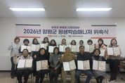 [경기경제신문] 양평군은 26일 평생학습센터에서 ‘2026년 양평군 평생학습매니저 위촉식’을 성황리에 개최했다. 군은 이번 위촉식에서 평생학습매니저 역량 강화 연수를 이수하고 활동 신청서를 통해 지속적인 참여 의사를 밝힌 인원을 대상으로, △학습 여행 운영 참여 실적 △회의 참여도 △관련 사업 기여도 등 활동 전반의 성실성을 평생학습매니저 평가표에 따라 종합적으로 심사해 최종 17명의 평생학습매니저를 공식 위촉했다. 위촉된 평생학습매니저들은 앞으로 1년간 지역 평생학습 활성화를 위해 주민의 학습 참여를 독려하고, 평생교육 프로그램 기획·운영 지원, 학습자 상담 및 만족도 조사 등 현장 중심의 역할을 수행하게 된다. 이날 위촉식은 평생교육 관계자와 위촉자들이 참석한 가운데 △위촉장 수여 △향후 활동 계획 공유 △평생학습 발전 과제 논의 등의 순서로 진행됐다. 위촉된 매니저들은 온행복센터(읍·면·동 평생학습센터)와 우리 동네 학습공간을 중심으로 지역 맞춤형 학습 콘텐츠 개발·운영, 학습자 요구 조사, 학습 지원 체계 구축 등에 참여할 예정이다. 전진선 양평군수는 “평생학습매니저는 주민의 삶과 평생학습을 일상 속에서 연결하는 중요한 역할을 맡고 있다”며 “이번 위