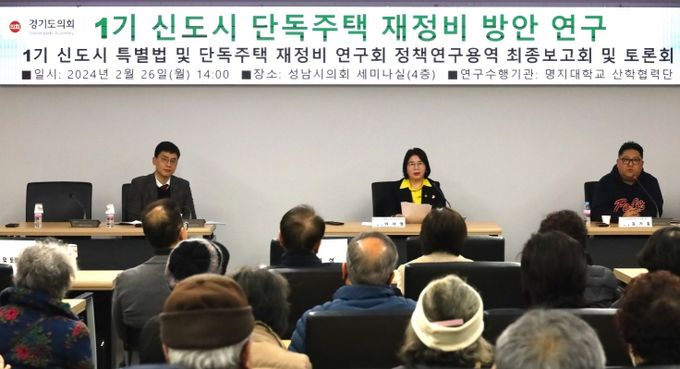 [경기경제신문] 경기도의회 안전행정위원회 이서영 의원(국민의힘, 비례)이 회장으로 있는 경기도의회 의원 연구단체인 “1기 신도시 특별법 및 단독주택 재정비 연구회”는 26일 성남시의회 의원세미나실에서 ‘1기 신도시 단독주택 재정비 방안 연구용역’의 최종보고회 및 토론회를 개최했다.