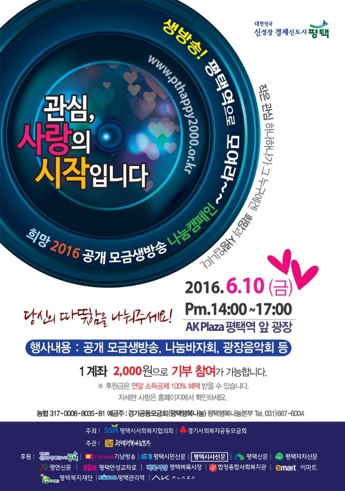 【경기경제신문】평택시는 더불어 함께 살아가는 사회분위기 조성을 위해 오는 6월 10일 ‘희망 2016 평택시 공개 모금생방송 나눔 캠페인’을 평택역 앞 광장에서 개최한다.