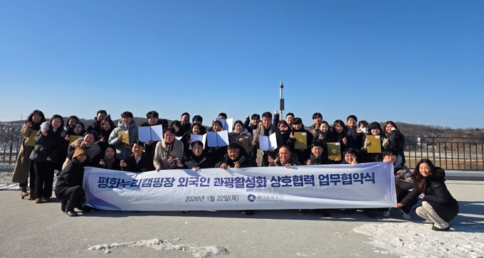 [경기경제신문] 경기관광공사(이하 공사)가 올해 외국인 관광객 유치 확대 및 체류형 관광 활성화를 위해 ‘평화누리캠핑장’의 경기북부 체류형 관광 명소화에 박차를 가한다. 이를 위해 경기관광공사는 22일 오후, 임진각 평화누리에서 국내 주요 인바운드 여행사 31개사와 업무협약(MOU)을 체결했다고 23일 밝혔다.