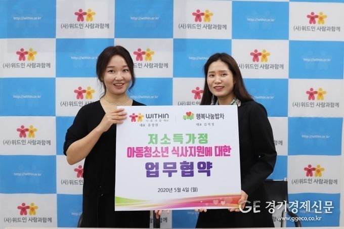 [경기경제신문] 비영리 사단법인 위드인사람과함께(회장 유정원)와 행복나눔밥차(대표 김희정)가 4일 "저소득아동청소년을 위한 행복(식사)나눔 협약식"을 체결했다.