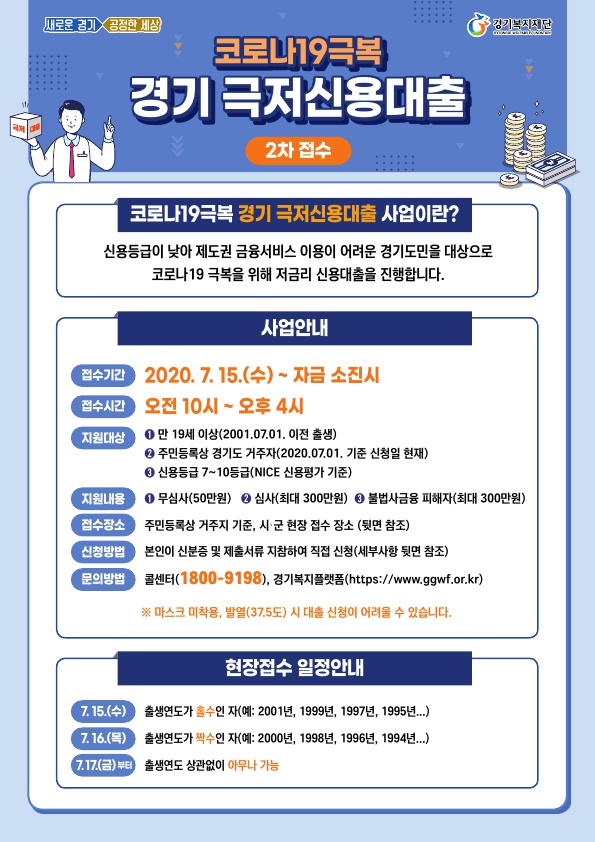 [경기경제신문] 광주시는 오는 15일부터 코로나19 극복을 위한 ‘경기 극저신용대출’ 2차 접수를 실시한다고 13일 밝혔다.