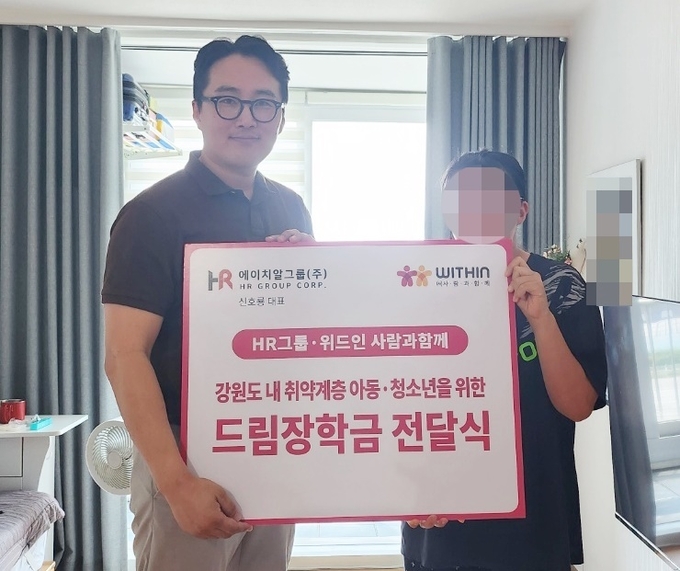 (사)위드인 사람과함께 김대호 대표는 “장학금 지원에 함께해 주신 에이치알그룹㈜과 임직원분들에게 감사를 표하며 복지 사각지대에 놓여 어려움을 겪고 있는 아이들이 따뜻한 나눔과 사랑으로 희망을 가지고 꿈을 키우며 자라날 것”이라고 말했다.