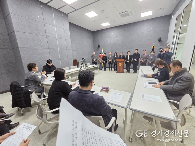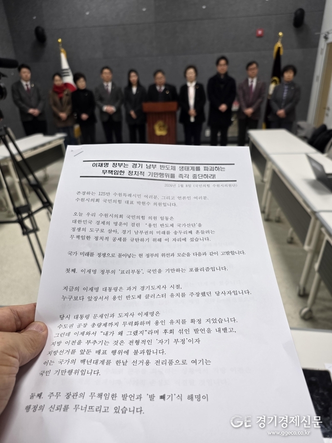[경기경제신문] 수원시의회 국민의힘 의원들이 8일 의회 1층 브리핑룸에서 기자회견을 열고 이재명 정부의 '용인 반도체 국가산업단지 이전' 논의를 강력히 규탄하고 기존 계획의 차질 없는 이행을 촉구했다.