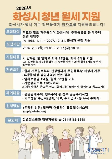 [경기경제신문] 화성특례시가 청년들의 주거비 부담을 덜고 안정적인 주거 생활을 지원하기 위해 2월 9일부터 2월 27일까지‘청년 월세 지원 사업’ 신청자를 모집한다고 밝혔다.