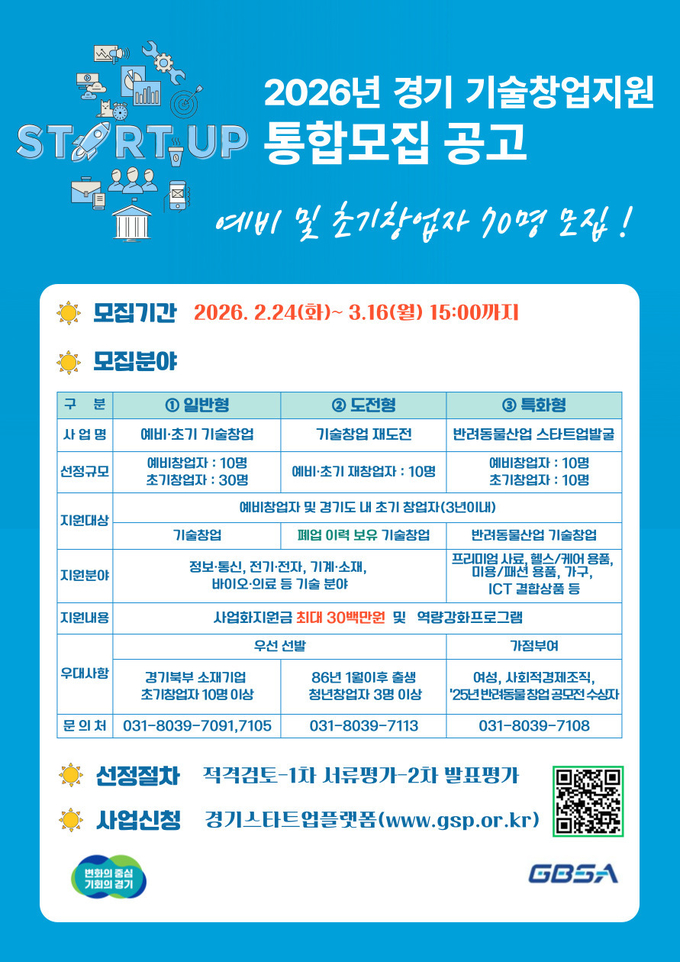 [경기경제신문] 경기도경제과학진흥원(이하 경과원)은 다음 달 16일까지 도내 예비창업자와 초기·재도전 창업자를 대상으로 ‘2026년 경기 기술창업 지원사업’ 통합 모집을 진행해 총 70개사를 선발한다고 밝혔다.