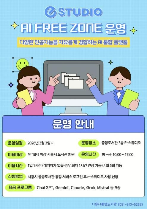 [경기경제신문] 시흥시중앙도서관은 시민들의 인공지능(AI) 활용 역량 강화를 위해 시 정보통신과와 협업해 도서관 3층 e-스튜디오에 ‘인공지능(AI) 프리 존(Free Zone)’을 구축하고, 오는 3월 3일부터 본격 운영에 들어간다.