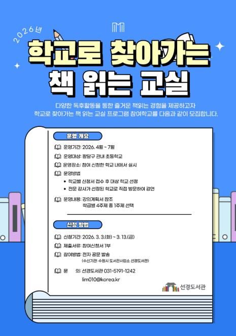 [경기경제신문] 수원시 선경도서관은 ‘2026년 학교로 찾아가는 책 읽는 교실’에 참여할 팔달구 관내 초등학교를 13일까지 모집한다.