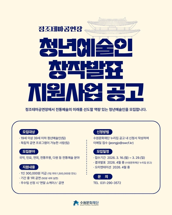 [경기경제신문] 수원문화재단(대표이사 곽도용) 정조테마공연장은 오는 29일까지 ‘2026 정조테마공연장 청년예술인 창작발표 지원사업’에 참여할 청년예술인을 모집한다. 이번 사업은 전통예술 분야의 역량 있는 청년예술인을 발굴하고, 창작 활동의 기회를 제공하기 위해 마련했다.