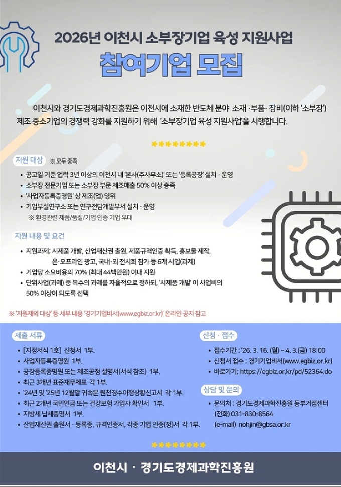 경과원은 ‘2026년 이천시 소부장기업 육성 지원사업’에 참여할 역량 있는 기업을 다음 달 3일까지 모집한다고 16일 밝혔다.