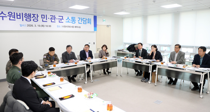 [경기경제신문] 수원특례시의회(의장 이재식)는 19일 의회 세미나실에서 공항 소음피해지역 주민들과 군, 시 관계자가 함께하는 ‘민·관·군 소통 간담회’를 개최하고 소음피해 해소를 위한 실질적인 대응 방안 마련에 나섰다.