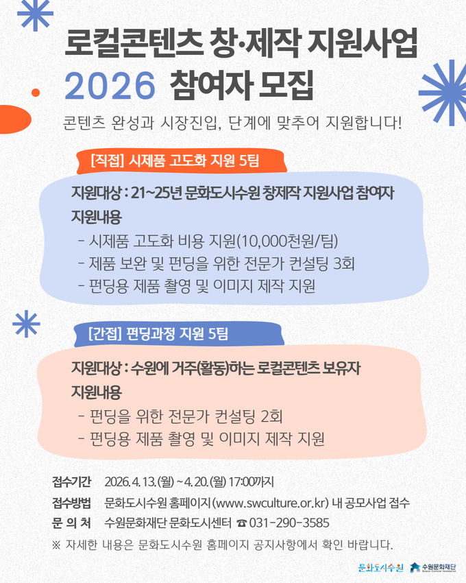 수원문화재단 관계자는 “이번 로컬콘텐츠 창·제작 지원사업은 수원만의 로컬콘텐츠가 실제 시장에서 경쟁력을 갖출 수 있도록 지원하는데 목적이 있다”며, “수원의 문화적 가치를 활용한 콘텐츠 개발에 수원 로컬 크리에이터의 많은 참여를 바란다”고 밝혔다.