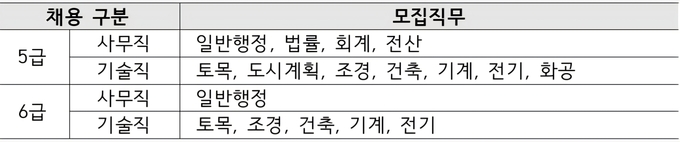 학력, 나이, 경력 등의 제한은 없으나 5급 기술직과 사무직 일부 분야는 기사 수준 자격을 보유해야 하며, 6급의 경우 최종 학력이 - 주택 공급 확대, 3기신도시 조성 등 신속한 정부 정책 수행 위해 추진