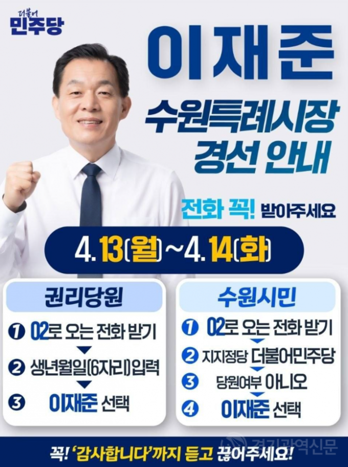 [경기경제신문] 더불어민주당 수원특례시장 최종 후보 선출을 위한 경선 투표가 4월 13일부터 시작됐다. 이재준 예비후보는 시민과 당원들의 적극적인 투표 참여를 요청했다.