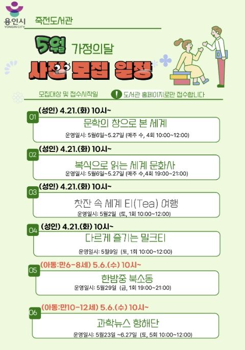 [경기경제신문] 용인특례시 죽전도서관은 오는 5월 가정의 달을 맞아 ‘2026년 5월 독서문화행사’를 개최한다.