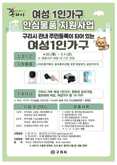 구리시 관계자는 “단순한 물품 지원을 넘어 시민들이 일상에서 심리적 안정을 느낄 수 있는 환경을 만드는 것이 이번 사업의 핵심”이라며, “앞으로도 지속적인 정보 수집과 제도 보완을 통해 더욱 촘촘한 안전망을 구축해 나가겠다.”라고 밝혔다.