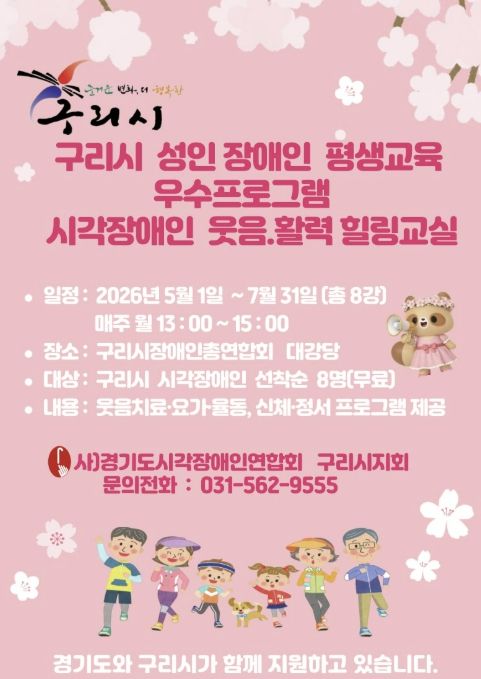 [경기경제신문] 사단법인 경기도시각장애인연합회 구리시지회는 구리시와 경기도의 지원을 받아 2026년 5월부터 ‘시각장애인 웃음·활력 힐링 교실’을 운영할 예정이라고 밝혔다.