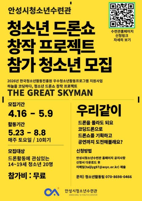 [경기경제신문] 안성시청소년수련관은 미래 디지털 인재 양성을 위한 청소년 참여형 프로그램 '하늘을 코딩하다, 청소년 드론쇼 창작 프로젝트 ‘THE GREAT SKYMAN’'에 참여할 청소년을 4월 16일 ~ 5월 8일까지 모집한다고 밝혔다.
