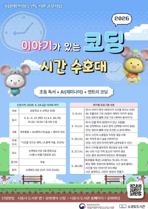 [경기경제신문] 시흥시 소래빛도서관은 국립어린이청소년도서관이 주최하는 ‘2026년 이야기가 있는 코딩’ 공모사업 운영기관으로 선정돼 오는 5월 6일부터 어린이 대상 독서·디지털 융합 프로그램을 운영한다.
