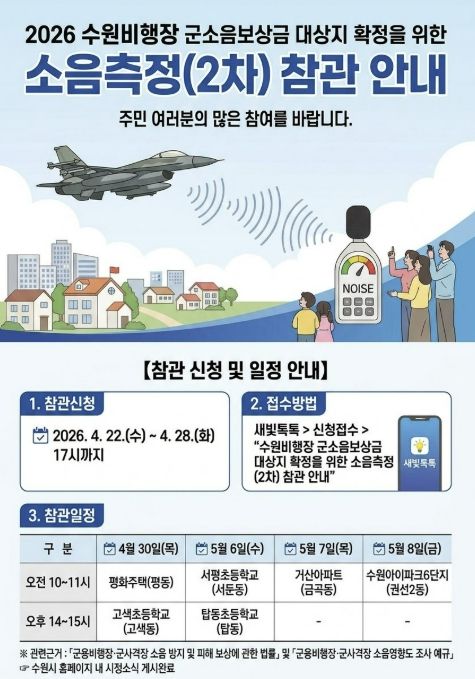 [경기경제신문] 수원특례시가 수원비행장 인근 주민들의 소음 피해 보상 근거가 될 국방부의 ‘수원비행장 소음 영향도 조사 2차 소음측정’ 주민 참관 참여자를 모집한다. 4월 28일까지 새빛톡톡으로 신청할 수 있다.