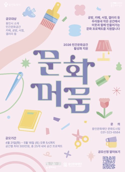 [경기경제신문] 용인문화재단은 오는 5월 16일까지 ‘민간문화공간 활성화 지원사업 '문화머뭄'’의 참여 공간을 모집한다고 밝혔다. 지난해 25개소 공간에서 203회의 프로그램을 운영하며 2,101명의 시민 참여를 이끌어낸 ‘문화머뭄’ 사업은 올해 재단 자체 재원을 매칭하여 총 25개소의 민간문화공간을 선정하고, 공간별 최대 300만 원까지 프로젝트 운영비를 지원할 예정이다.