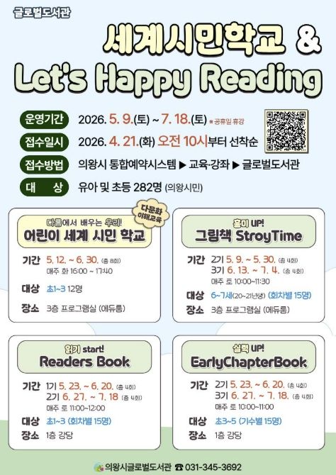 [경기경제신문] 의왕시 글로벌도서관이 책을 통해 세상을 이해하고 체험하는 다문화 이해 프로그램 '어린이 세계 시민 학교'와 영어 읽기 문해력 향상을 위한 단계별 맞춤 프로그램 'Let’s Happy Reading'의 참여자를 모집한다.