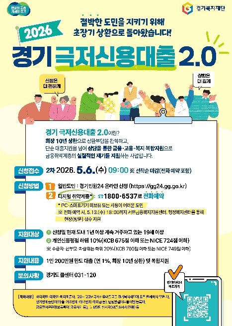 [경기경제신문] 경기도가 5월 6일 오전 9시부터 금융취약계층의 생활 안정을 지원하는 ‘경기 극저신용대출 2.0’ 2차 접수를 시작한다.