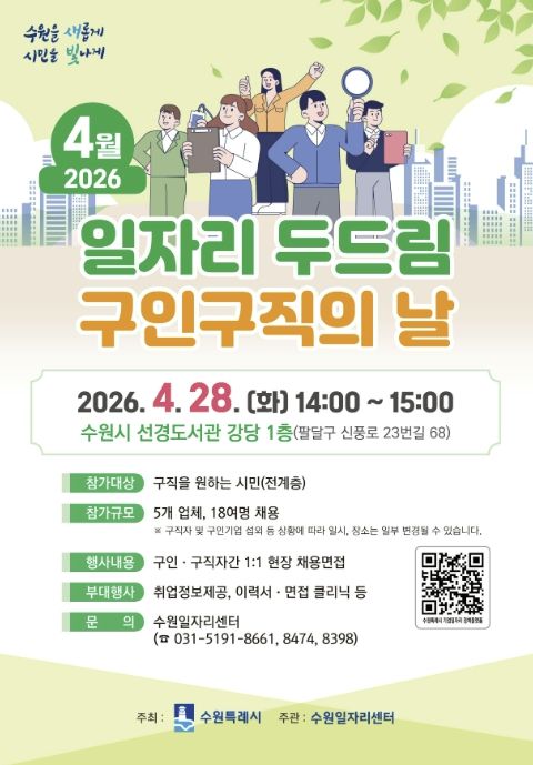 [경기경제신문] 수원특례시는 4월 28일 오후 2시부터 3시까지 선경도서관 강당에서 ‘4월 일자리 두드림 구인·구직의 날’을 개최한다.