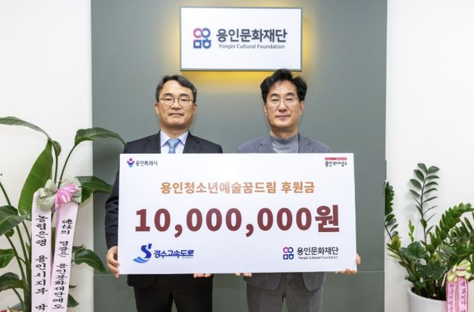 [경기경제신문] 용인문화재단은 지난 23일 경수고속도로(주)로부터 용인시 관내 청소년 예술 장학사업인 ‘용인청소년예술꿈드림’ 지원을 위한 기부금 1,000만 원을 기탁받았다고 밝혔다. 이번 후원은 용인서울고속도로를 이용하는 통행차량 1대당 1원씩 적립하고, 사회공헌예산을 추가로 편성해 지역사회 환원과 기업의 사회적 책임 실천 차원에서 추진됐다.