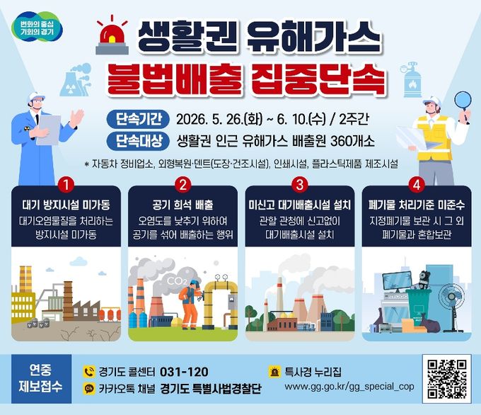 [경기경제신문] 경기도 특별사법경찰단이 5월 26일부터 6월 10일까지 2주간 주거지·학교·병원 등 생활권 인근 지역의 유해가스 배출 사업장을 대상으로 불법행위를 집중단속 한다.