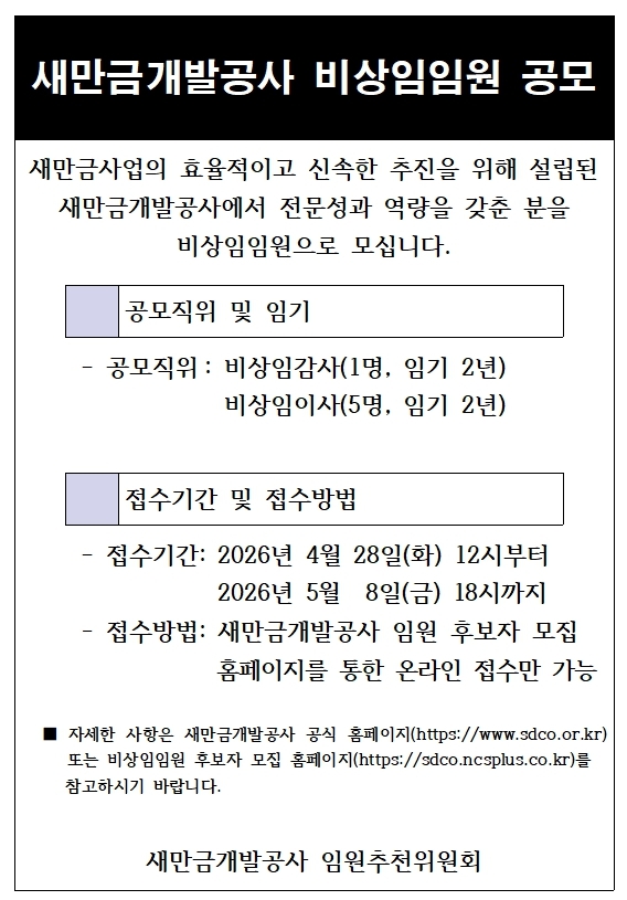 [경기경제신문] 새만금개발공사(이하 ‘공사’) 임원추천위원회는 28일 공고를 통해 비상임임원(감사·이사)를 공모한다고 밝혔다.
