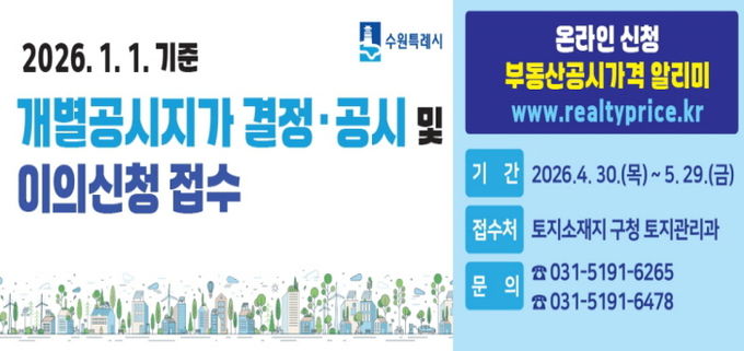 [경기경제신문] 수원시 권선구는 4월 30일 결정·공시되는 개별공시지가에 대해 4월 30일부터 5월 29일까지 이의신청을 접수한다고 밝혔다.