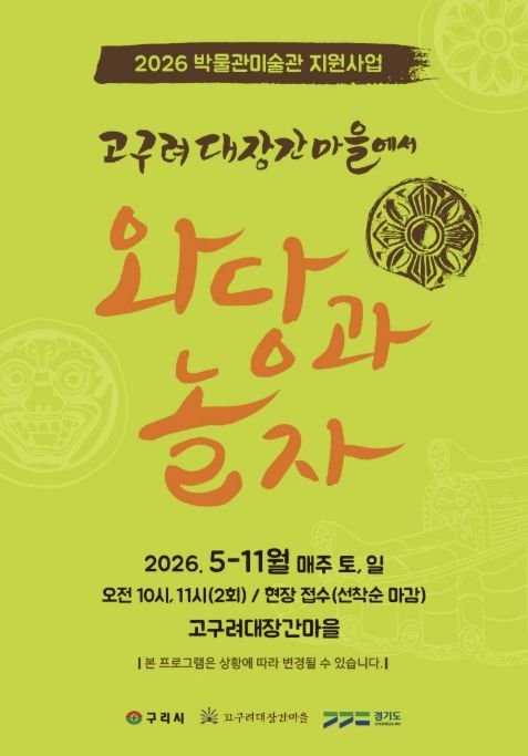 [경기경제신문] 구리시는 오는 5월 2일부터 11월 1일까지 매주 주말 고구려대장간마을에서 2026년 경기도 박물관·미술관 지원사업의 하나로 ‘고구려대장간마을에서 와당과 놀자’ 체험 행사를 운영한다고 밝혔다.