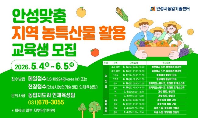 이번 교육은 6월부터 7월까지 안성에서 주로 재배되는 블루베리 등 과일류를 활용한 제과·떡·디저트 실습과, 지역 재배 화훼를 활용한 실습 등 총 2가지 주제로 진행된다. 총 12회에 걸쳐 196명의 교육생을 선발할 예정이다.