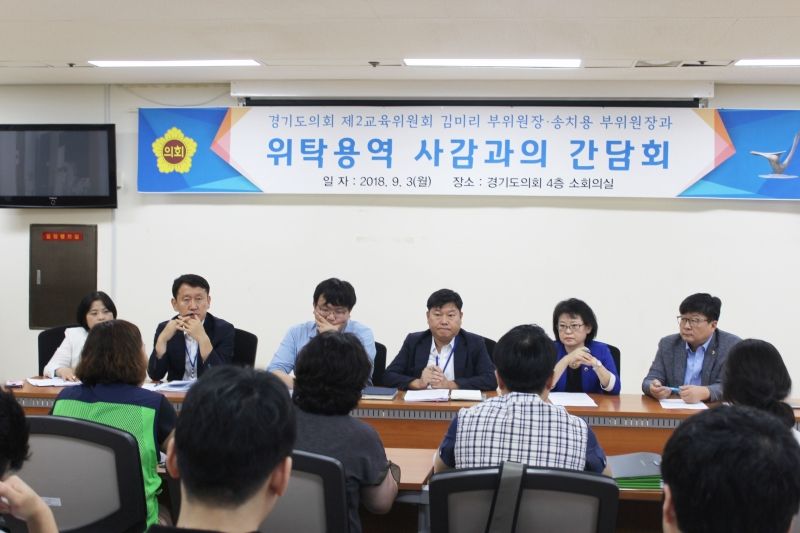 【경기경제신문】경기도의회 제2교육위원회는 김미리 의원(더불어민주당, 남양주1)과 송치용 의원(정의당, 비례)이 3일 경기도의회 4층 회의실에서 위탁용역 사감과의 간담회를 개최했다고 밝혔다.