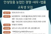 [경기경제신문] 안성시농업기술센터가 지역 농업인의 안정적인 영농 활동을 돕기 위해 오는 31일까지 ‘안성맞춤 농업인 경영·세무·법률 교육’ 교육생을 모집한다. 이번 교육은 전문가 특강을 통해 농가 운영 중 발생할 수 있는 경영적, 법적 문제를 사전에 예방하고 해결할 수 있는 역량을 키워주기 위해 마련됐다. 교육은 오는 4월 6일부터 30일까지 주제별 지정된 날짜에 진행된다. 모집 분야는 ▲농업 경영 ▲농업 세무 ▲농업 법률 등 3개 과정이며, 분야별로 30명씩 총 90명을 선발한다. 신청 인원이 초과할 경우 내부 선발 기준에 따라 교육생을 최종 선정할 예정이다. 신청 자격은 농업 경영에 관심 있는 안성시민이라면 누구나 가능하며, 접수는 3월 31일까지다. 참여를 희망하는 시민은 이메일을 보내거나 농업기술센터 농업지도과(보개원삼로 219)를 방문해 신청하면 된다. 시 관계자는 “농업인의 눈높이에 맞춘 경영·법률·세무 전문가 특강이 농가 역량을 강화하는 좋은 기회가 될 것”이라며, “안성 농업의 내실을 다지고 싶은 시민 여러분의 많은 관심과 참여를 바란다”고 말했다.