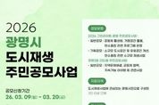 [경기경제신문] 광명시가 오는 20일까지 주민이 스스로 마을 문제를 해결하고 공동체 활성화를 이끌어갈 ‘2026년 도시재생 주민공모사업’ 참여단체를 모집한다. 이번 공모사업은 광명시 전역을 대상으로 하는 ‘그린라이트 광명 주민공모사업’과 광명3동 더드림 도시재생활성화지역을 대상으로 하는 ‘광명3동 더드림 주민공모사업’ 두 가지 유형으로 운영한다. ‘그린라이트 광명 주민공모사업’은 일반공모 2팀과 기획공모 1팀을 선정해 공동체 활성화, 탄소중립 프로그램 운영, 소규모 도시공간 개선 등 주민 아이디어를 사업으로 발전시키는 활동을 지원한다. 일반공모팀은 팀당 최대 500만 원, 기획공모팀은 팀당 최대 1천만 원을 지원한다. ‘광명3동 더드림 주민공모사업’은 광명3동 도시재생 활성화지역의 마을 문제 해결과 공동체 협력 프로그램 등을 주제로 공모를 진행한다. 4팀을 선정하며 팀당 최대 500만 원을 지원한다. 시는 주민공모사업 이해를 돕기 위해 오는 12일 오후 3시 광명3동 어울리기 문화발전소(광명동 126-31)에서 사업설명회를 개최한다. 또한 사업 성과 확산을 위해 사전 컨설팅도 운영한다. 3월 23일 통합 컨설팅, 3월 24일부터 4월 3일까지 개별 컨설팅을